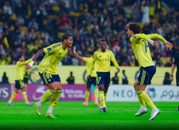 سجل أهداف النصر ثنائية من نصيب قائده البرتغالي كريستيانو رونالدو (31 و 45+3) ومواطنه جواو فيليكس (90+4) ليرفع كل منهما رصيده إلى 12 هدفاً في صدارة الهدافين .